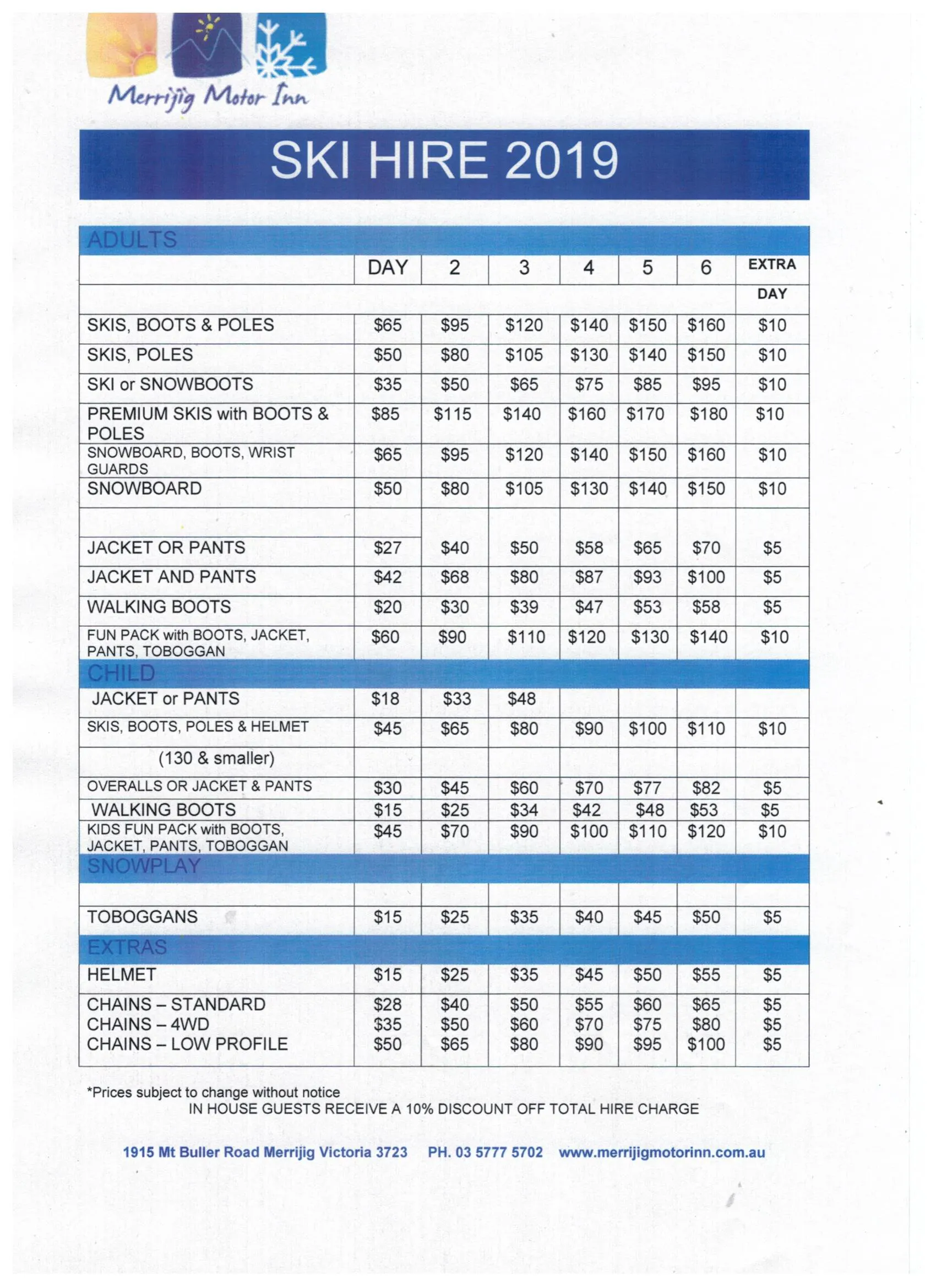 At Merrijig Motor Inn we have a great range of Ski Hire including; Skis, Boards, Toboggans, Clothing, Walking Boots,